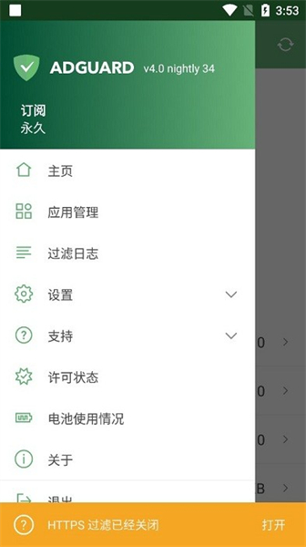 除了后台静默工作,AdGuard还提供了一个极具巧思的前端交互——小窗口的工具模式。开启后,一个轻量化的悬浮窗会常驻屏幕边缘,它不仅是快捷开关,更能实时显示被拦截的广告、跟踪器数量,让无形的保护变得可视化。这背后体现的是软件对用户体验的深度思考:安全工具不应是晦涩难懂的。