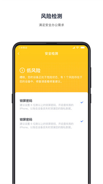 - 终端安全风险评估:飞连持续对接入的电脑、手机等多设备进行安全健康度检查,融合多种防护措施,让企业IT管理员对终端风险可视、可控,防患于未然。
