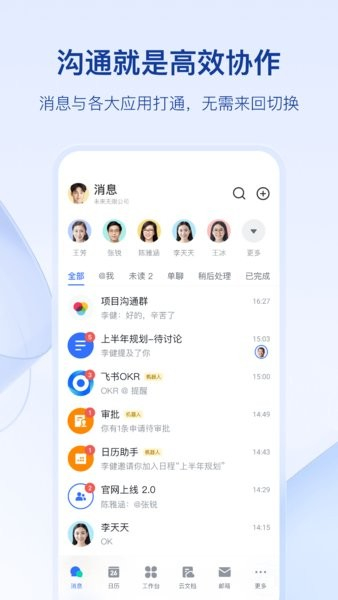 打开飞书,用户首先感受到的是其清晰、现代的主界面。与传统办公软件不同,飞书将“消息”、“日历”和“云文档”三大核心模块无缝衔接。其即时沟通功能远不止于聊天,而是通过会话分类、快捷表情回复、消息聚合等功能,让信息处理变得井然有序。